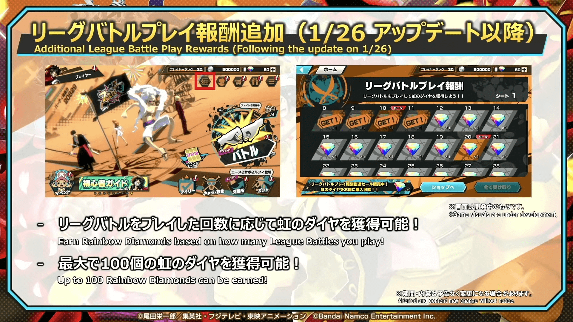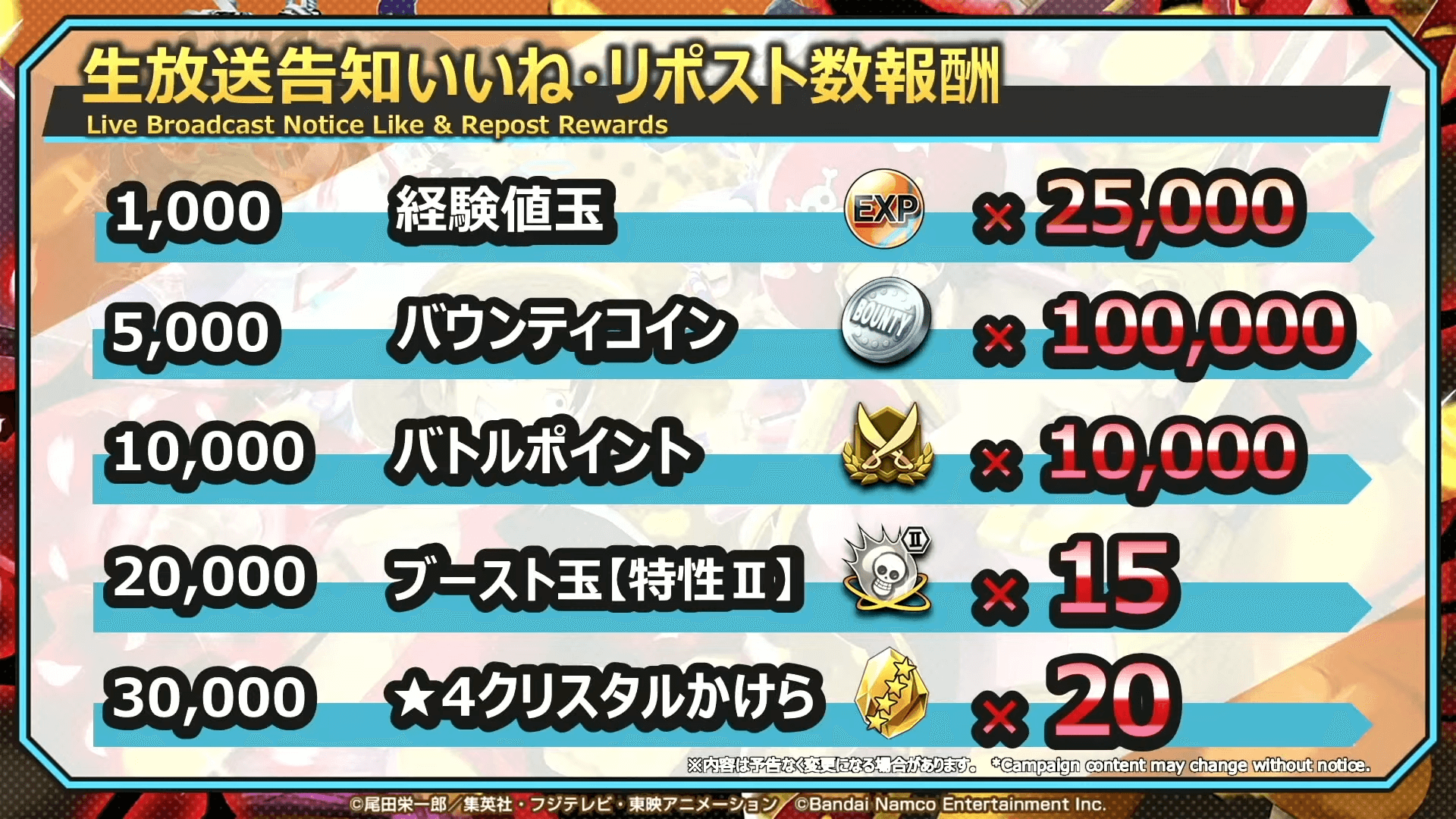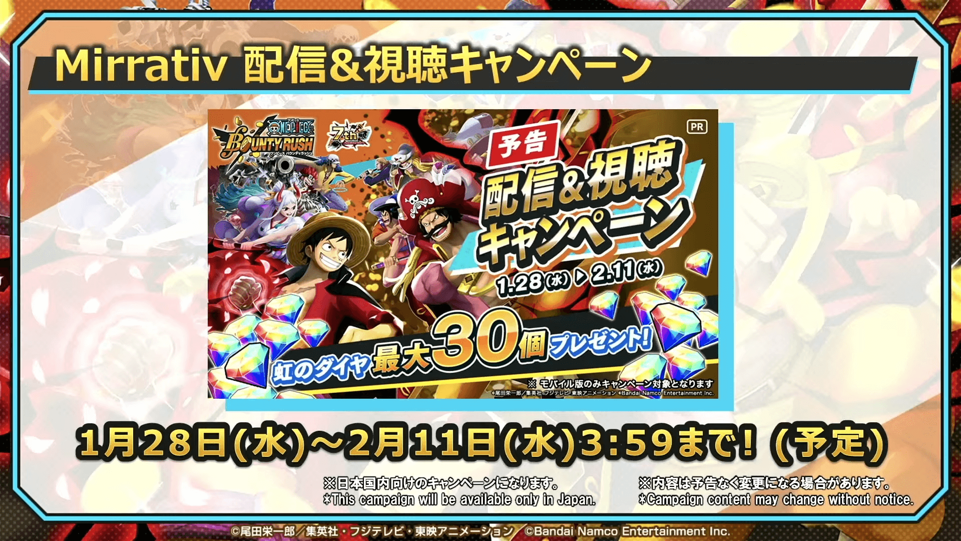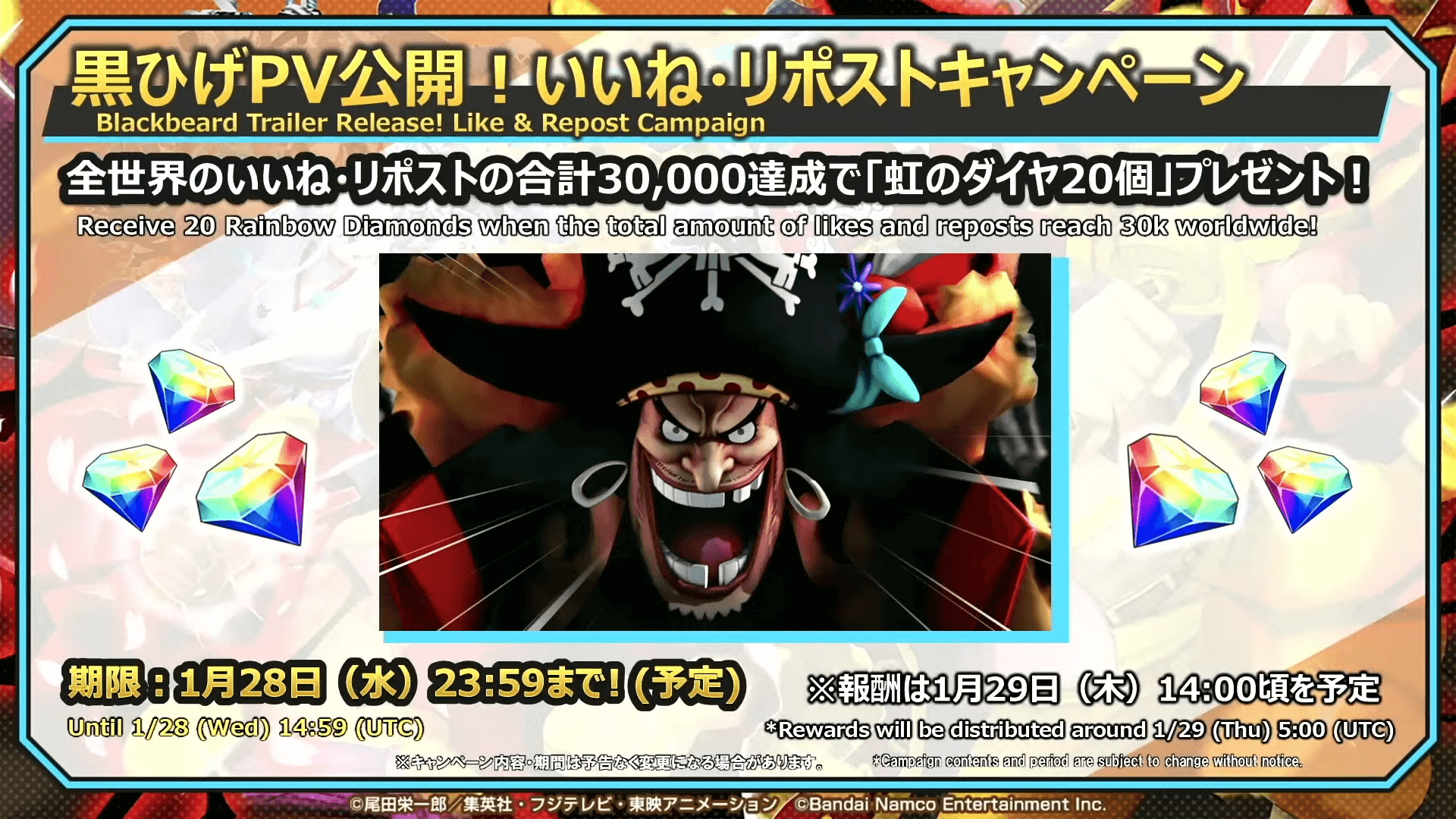 黒ひげの登場PVに合計3万のいいね・リポスト達成で、ダイヤが配布される。期限は1月28日までであり、貴重なダイヤなため、実装までにいいね・リポストを済ませよう。
