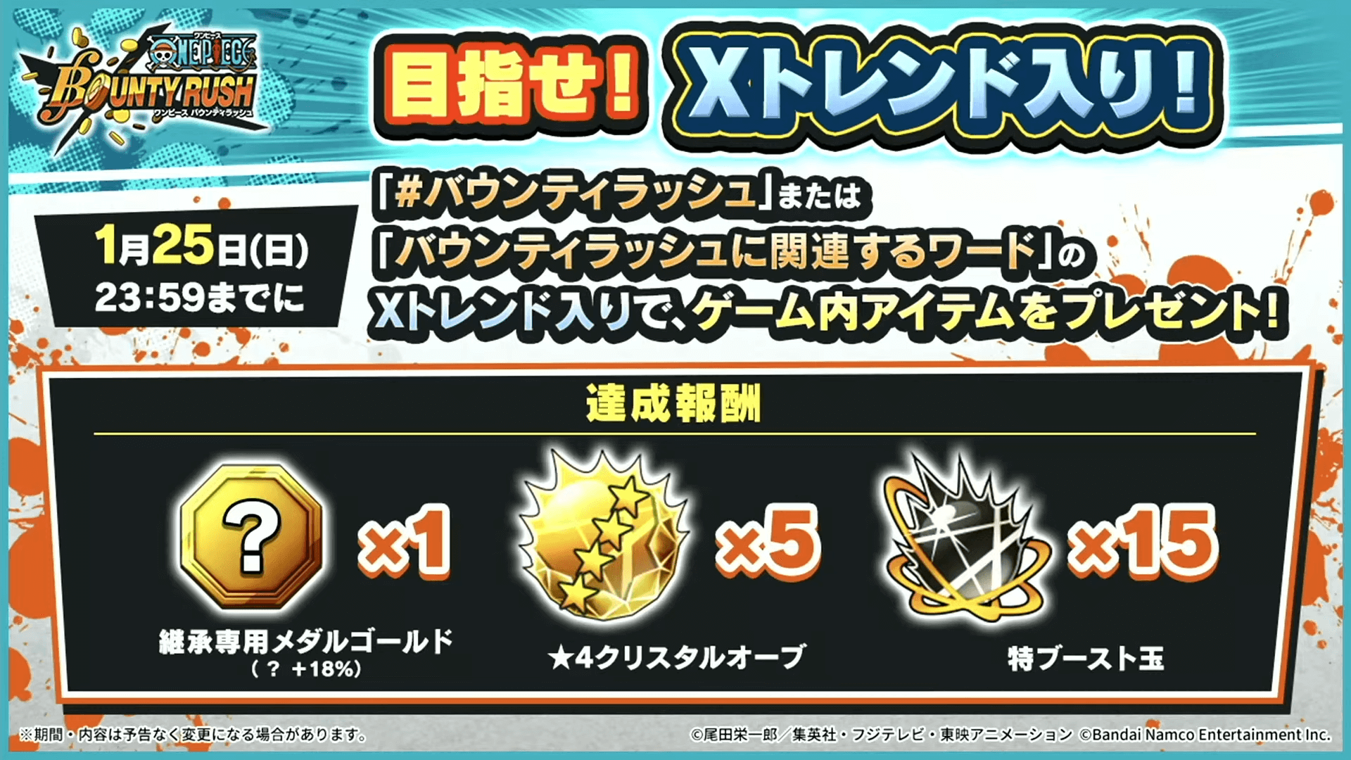 生放送中にXのトレンド入りを達成したため、攻撃18%メダルと☆4クリスタルオーブ、特ブースト玉が配布決定。アイテムは後日プレゼントボックスに直接配布される。