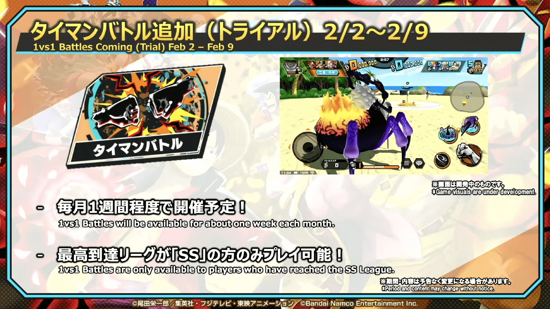タイマンバトルの実装が2月2日と告知された。毎月1週間開催され、リーグバトルと同じくランキングスコアで競える要素もあるようだ。参加するには、SSリーグに到達している必要があるため、今のうちにリーグバトルを進めよう。