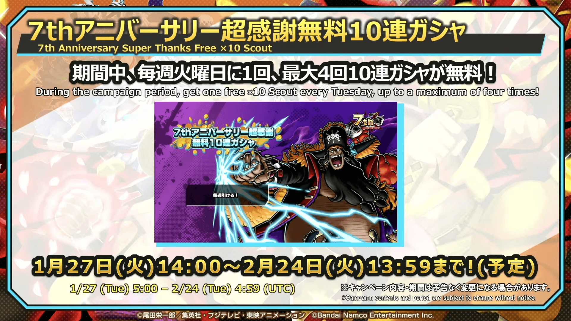 四皇黒ひげ実装後、無料10連ガチャが開催される。1週間に1回10連ガチャが、最大4回引けるイベントだ。低確率だが、四皇黒ひげも排出されるため、毎週火曜日に10連ガチャを必ず引こう。