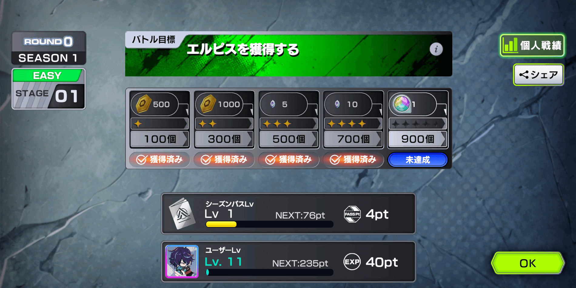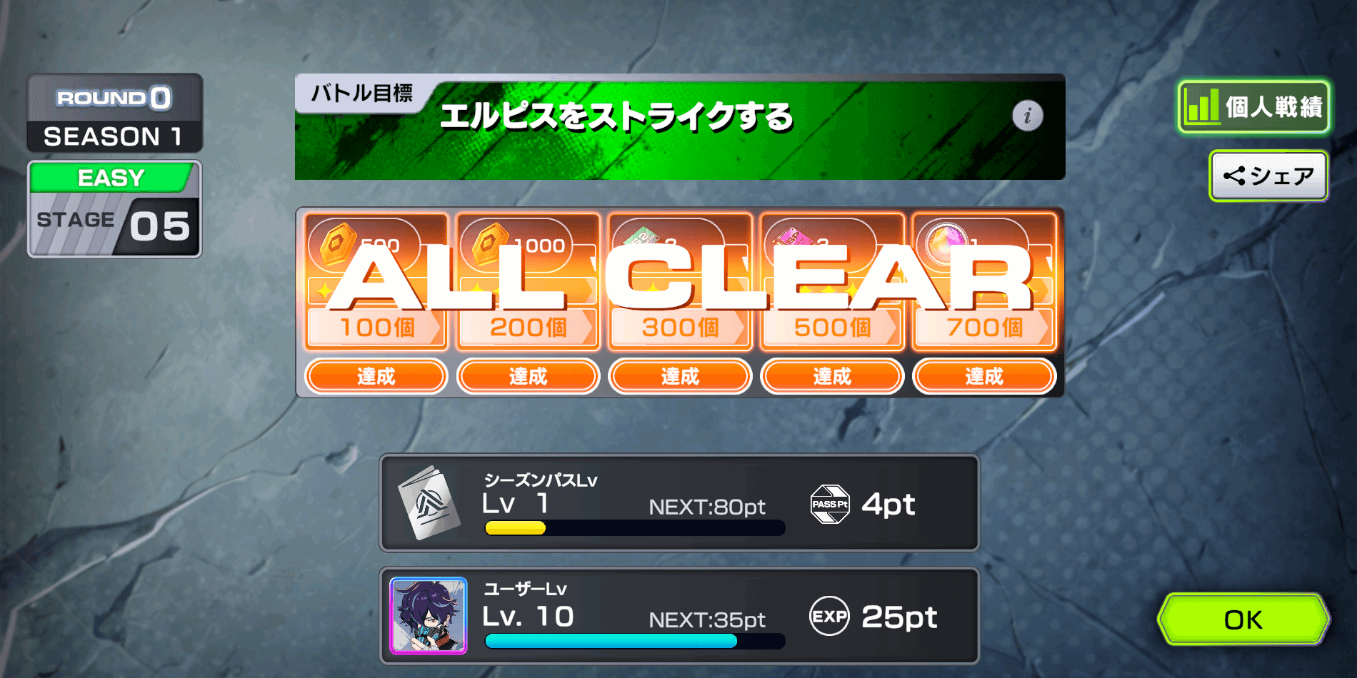 ユーザーレベルのポイントは、バトルの順位が高いほど貰えるポイントが多い。なるべく1位を目指してゲームをプレイしよう。シングルモードでも経験値は貰えるが、マルチのシーズンマッチなら1位で80ポイントと多くのポイントが貰える。