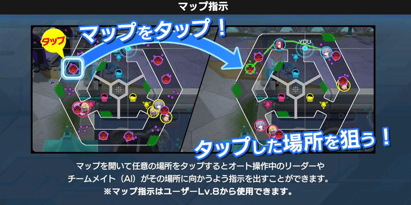 | Lv8 | 解放要素 マップ指示解説 マップの場所やエネミーを指示して移動させられる |