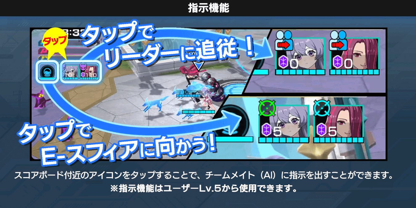 | Lv5 | 解放要素 指示機能解説 味方AIに追従やEスフィア移動の指示が可能になる |