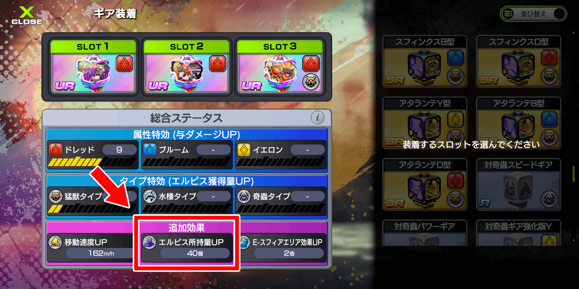 タイプ特効のギアが多めの場合は、エルピス所持量も確保しておこう。所持量が少ないままタイプ特効だけ特化していると、途中でエルピスの所持量が上限に達する可能性がある。
