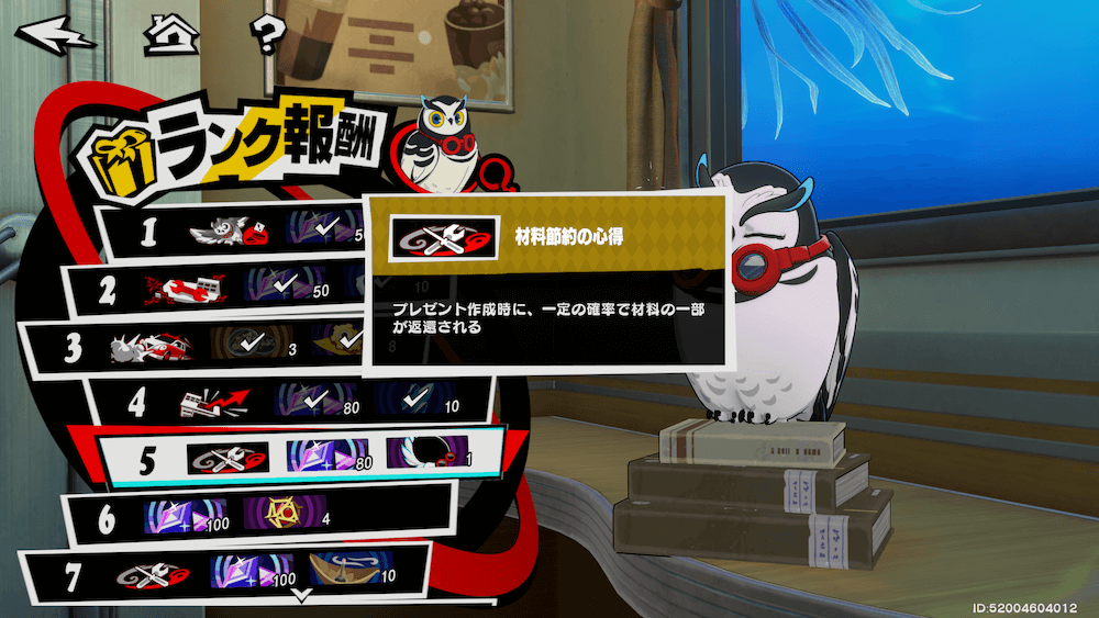 | ランク5 | ミヤザワパレスクリア後材料節約の心得 プレゼント作成時に、一定の確率で材料の一部が返還される |