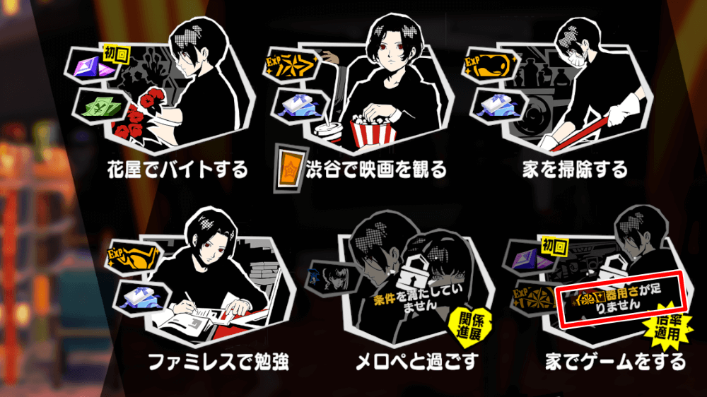 行動力を消費して人間パラメータを上げる場合は、パラメータが大きく上昇する映画鑑賞や読書がおすすめ。ただし、鑑賞費用や本の購入費が必要となるため、こまめにバイトやイベントなどでお金を稼いでおこう。