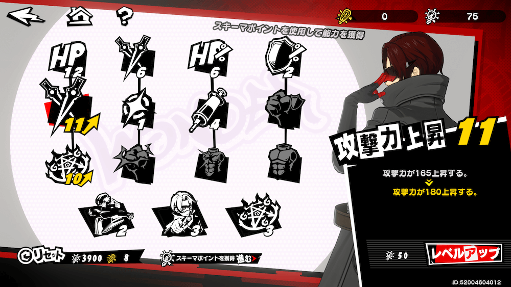 | スキーマ | ・専用のポイントを消費して強化 ・新ペルソナを入手するとポイント獲得 ・試練クリアで+ポイント獲得 |