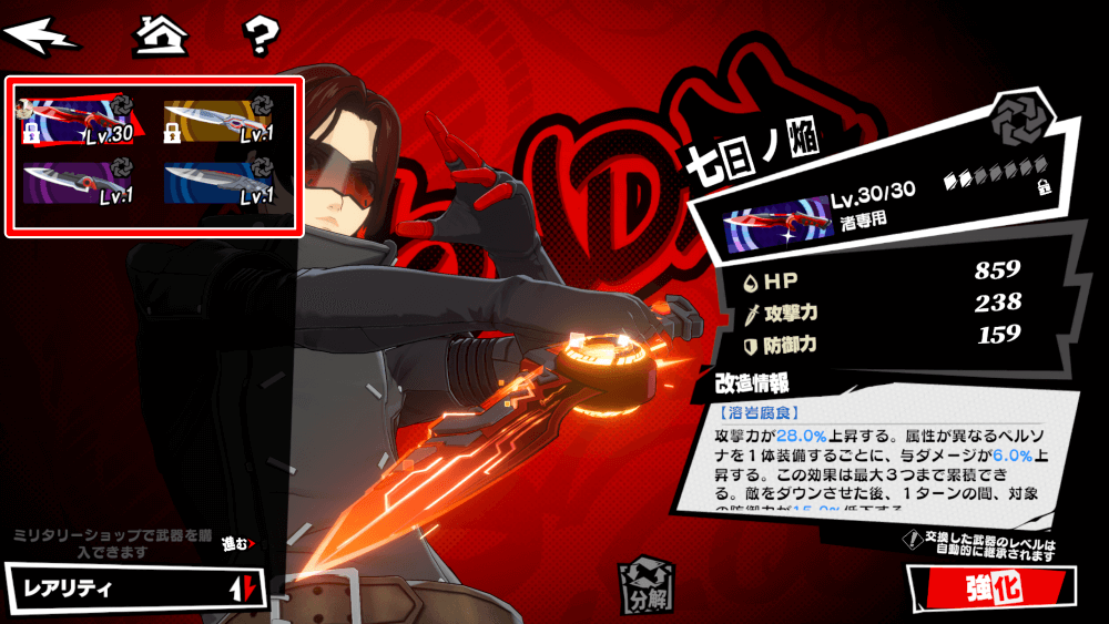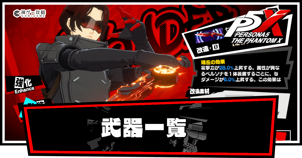 P5X(ペルソナ5X)のペルソナ5との武器について解説。武器一覧に加え、武器の改造のやり方などを掲載しているので、ペルソナ5:The Phantom Xをプレイする際の参考にどうぞ。