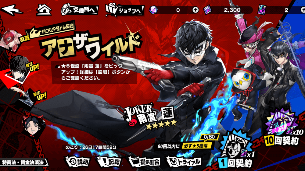 自在結晶とプラチナチケットで雨宮蓮ガチャを12連、ゴールドチケット16枚で新米怪盗サポートガチャを20連分引こう。ピックアップガチャで最強キャラである雨宮蓮が引ければ、リセマラ終了だ。