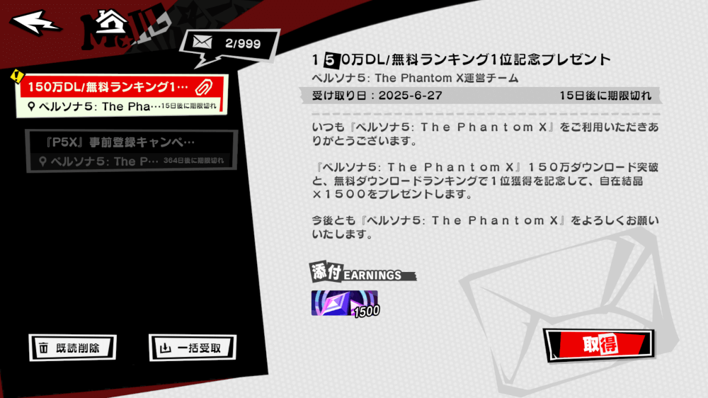 ガチャが解放されたら、メールから事前登録報酬のチケット20枚と、150万ダウンロード記念の自在結晶1500個を受け取ろう。メールを受け取った時点で、ピックアップガチャ10連と、初心者ガチャである新米怪盗サポート20連を回せる。