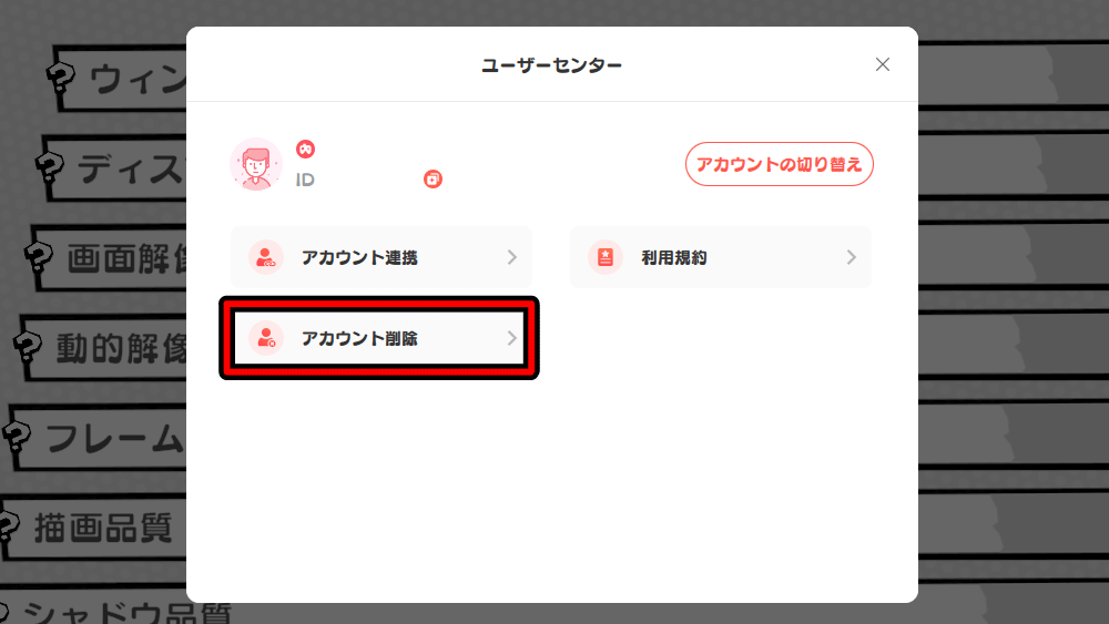 アカウントメニューに入ったら、アカウント削除を選択しよう。アカウント削除は、アカウント連携の下にある。