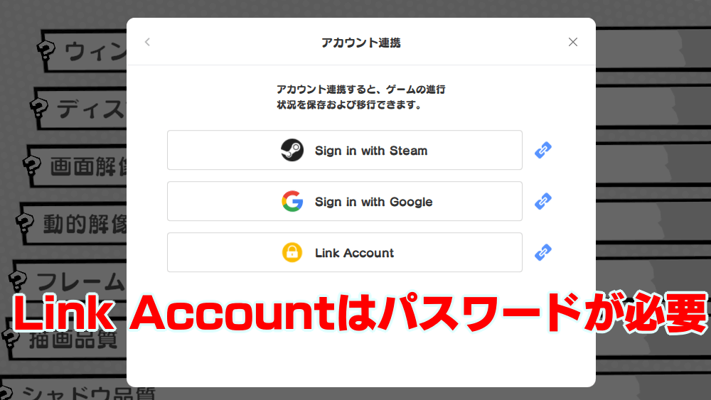 アカウント連携メニューで、連携先を選ぼう。Link Accountのみパスワードが要求されるので、