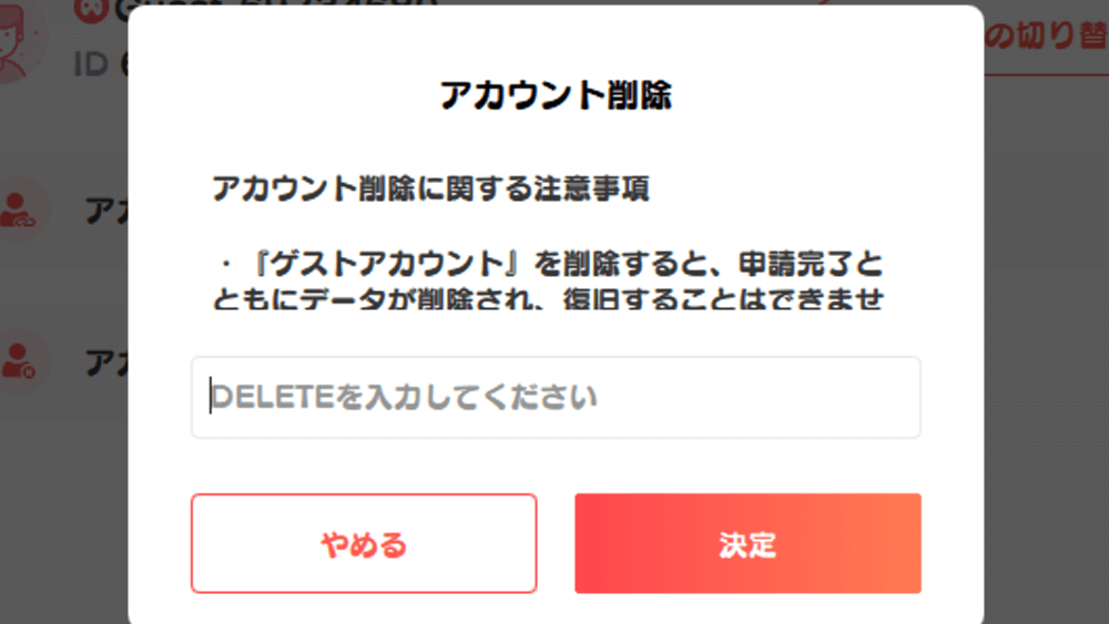 アカウント削除画面で、「DELETE」と入力して確認を押そう。正確に入力できていれば、アカウント削除が完了する。