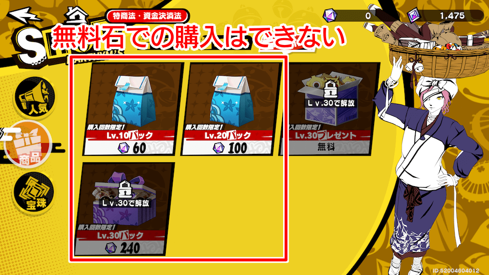 「ゴールドパック」や「スタートダッシュ」といったゴールドチケットしか入手できないパックの購入は避けたほうが良い。序盤で簡単に50連分は集まる上、限定キャラ入手に一切使えないため、購入しても戦力増強に繋がりづらい。どうしてもキャラ数が増やしたい場合は、異界宝珠そのものを購入し、限定キャラを引く回数を増やそう。