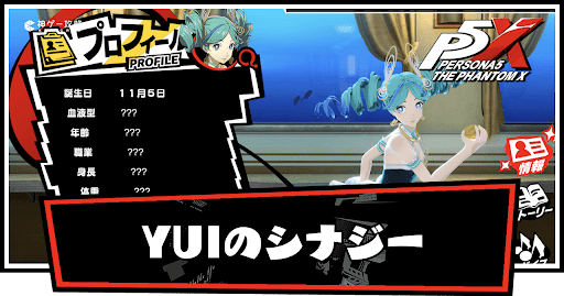 P5X(ペルソナ5X)のシナジー「YUI」について紹介。YUIのシナジー解放条件やシナジースキル、好きなものやランクアップ報酬についても掲載しているので、ペルソナ5:The Phantom Xをプレイする際の参考にどうぞ。