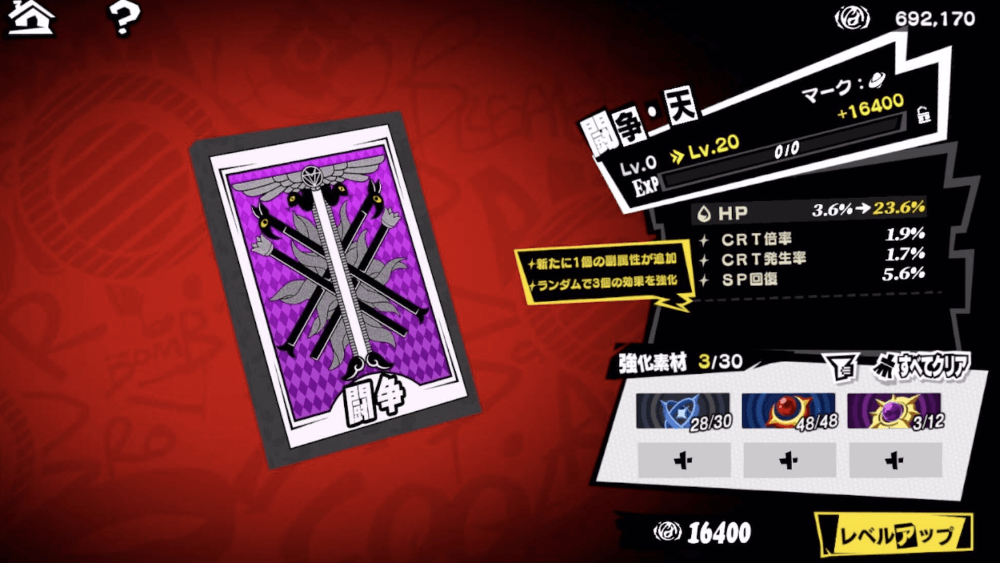 啓示カードは、怪盗メニューの啓示カードを選択して「強化」を選ぶとレベルアップできる。レベルアップには強化素材である宝石や、ほかの啓示カードが必要となるため、調伏の領域を周回して集めよう。