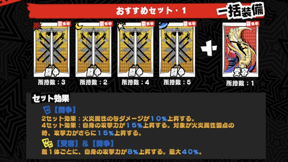 【2セット】 物理属性の与ダメージが10%上昇する【4セット】 2ターンの間、自身のクリティカルダメージが30%上昇する。クリティカルが発生した時、同じ効果を追加する |