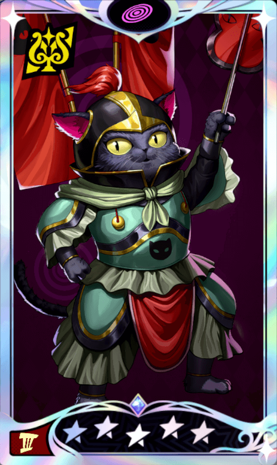 | 特性 | 干物をどうぞニャ 状態異常命中が15%上昇。戦闘開始時、味方全体の状態異常命中を9%上昇。状態異常命中が最も高い味方の状態異常命中を12%上昇(2ターン持続)。 |