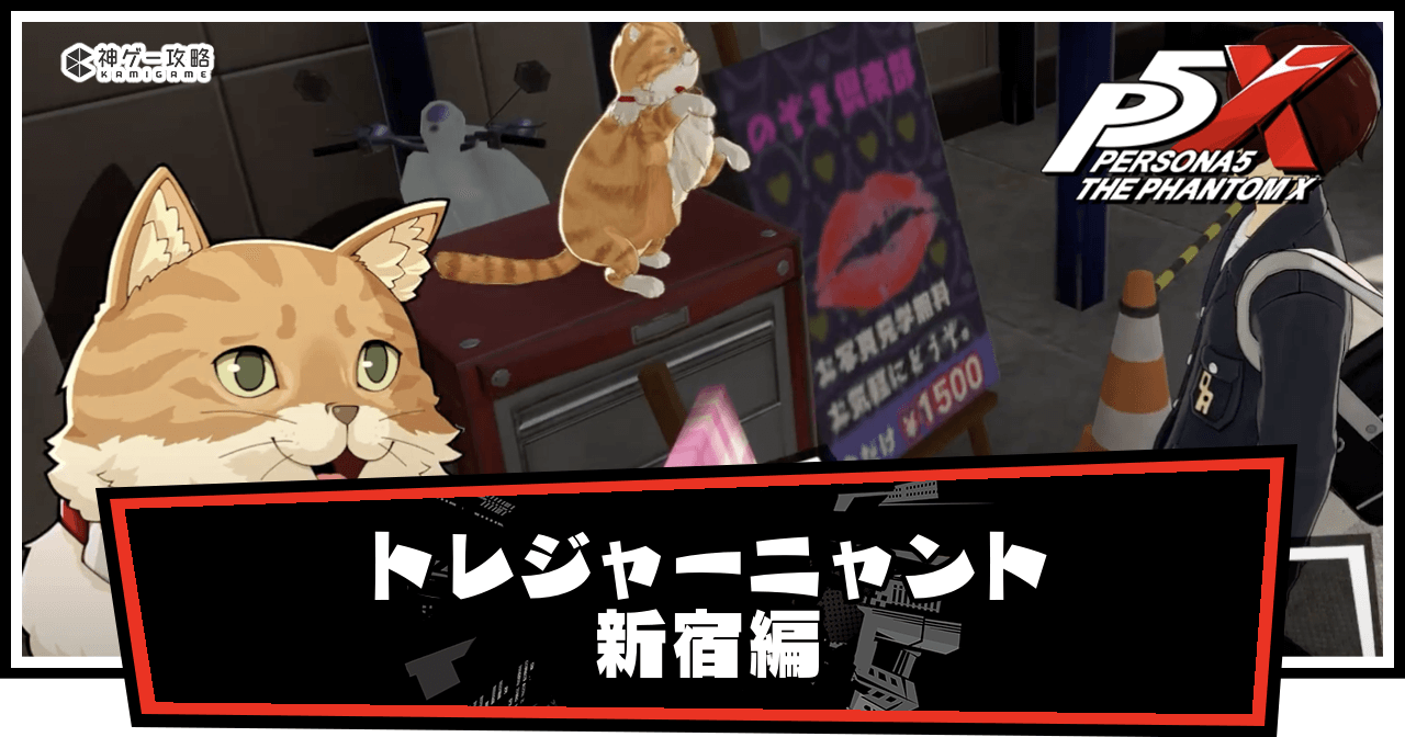 ペルソナ5X(P5X)のサイドミッション「トレジャーニャント・新宿編」について解説。茶トラの宝物の場所と入手方法について説明し、攻略チャートや報酬についても掲載しているので、ペルソナ5:The Phantom Xをプレイする際の参考にどうぞ。