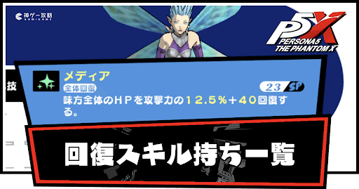 ペルソナ5X(P5X)の回復効果を持つペルソナを一覧で紹介。主人公が使用するペルソナの弱点や耐性、ロール、特性について掲載。ペルソナ5Xをプレイする際の参考にどうぞ。