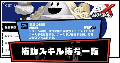 ペルソナ5X(P5X)の補助効果を持つペルソナを一覧で紹介。主人公が使用するペルソナの弱点や耐性、ロール、特性について掲載。ペルソナ5Xをプレイする際の参考にどうぞ。