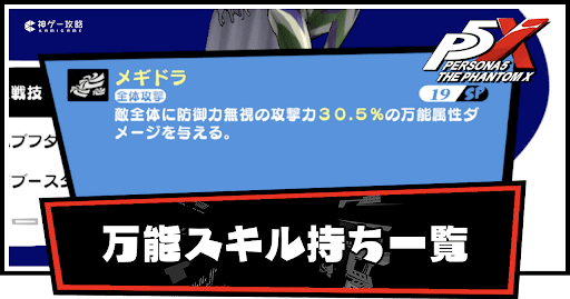 ペルソナ5X(P5X)の万能スキル持ちのペルソナを一覧で紹介。主人公が使用するペルソナの弱点や耐性、ロール、特性について掲載。ペルソナ5Xをプレイする際の参考にどうぞ。