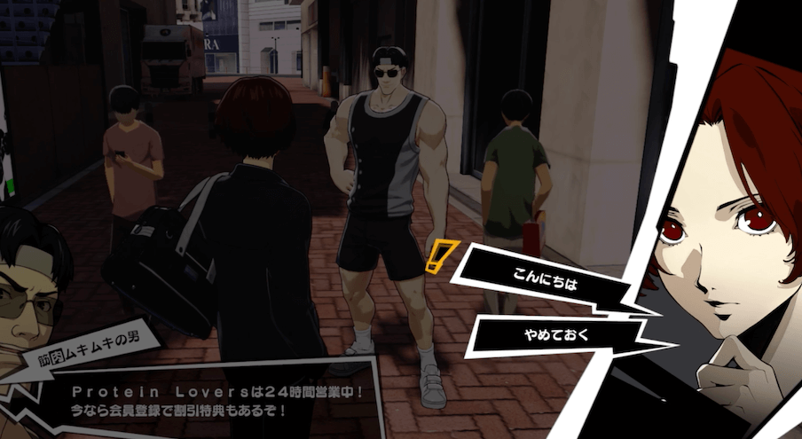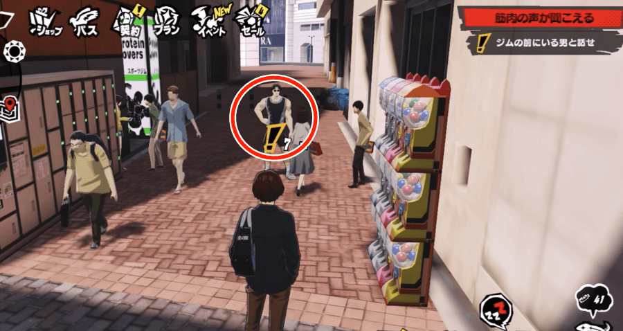 サイドミッション「筋肉の声が聞こえる」は、渋谷のセントラル街にあるジムの前で発生する。ミッション発生には都市生活の解放が必要だ。ミッションが開放されていなければ、メインミッション「夢の跡」を進めよう。