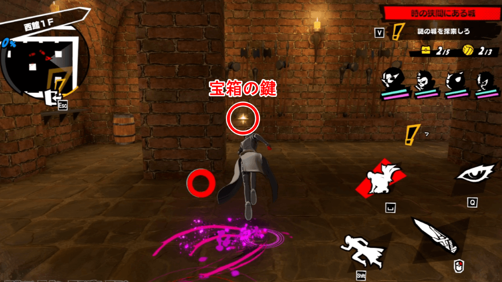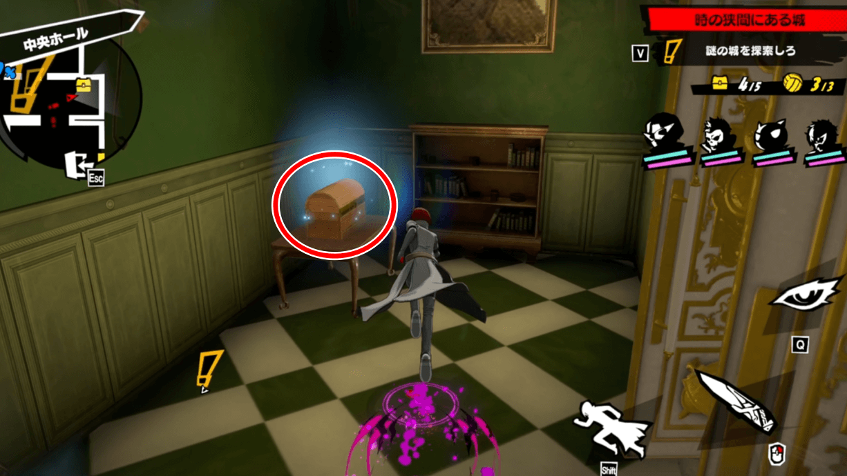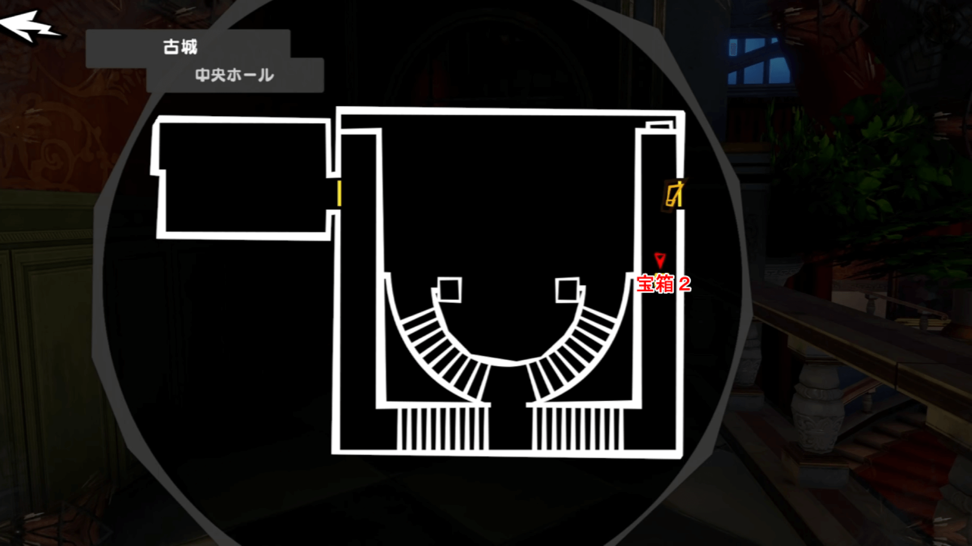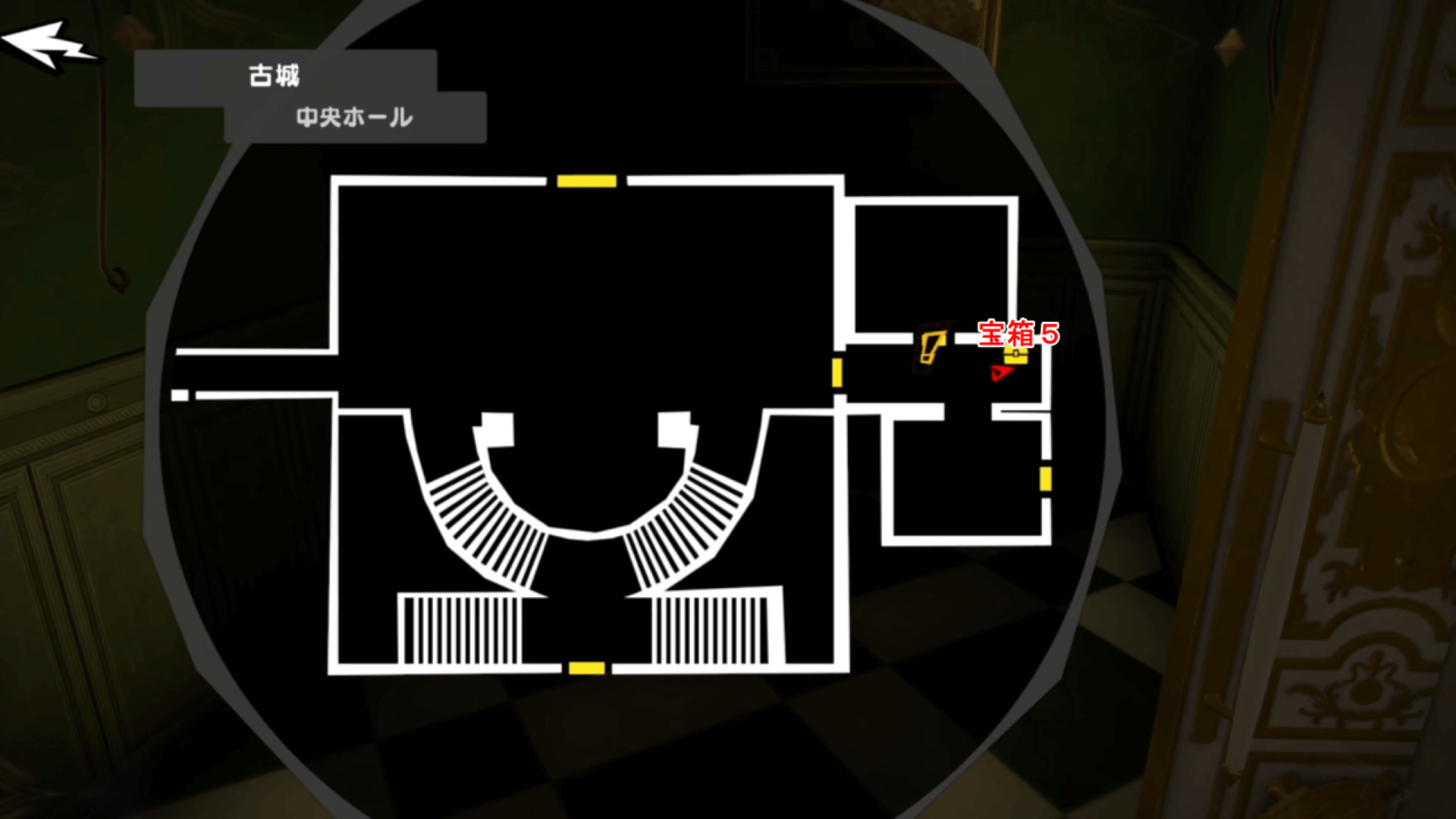 中央広間の宝箱を開けるには、鍵が必要だ。鍵は広間北東の武器棚にあるため、拾って宝箱を開けよう。
