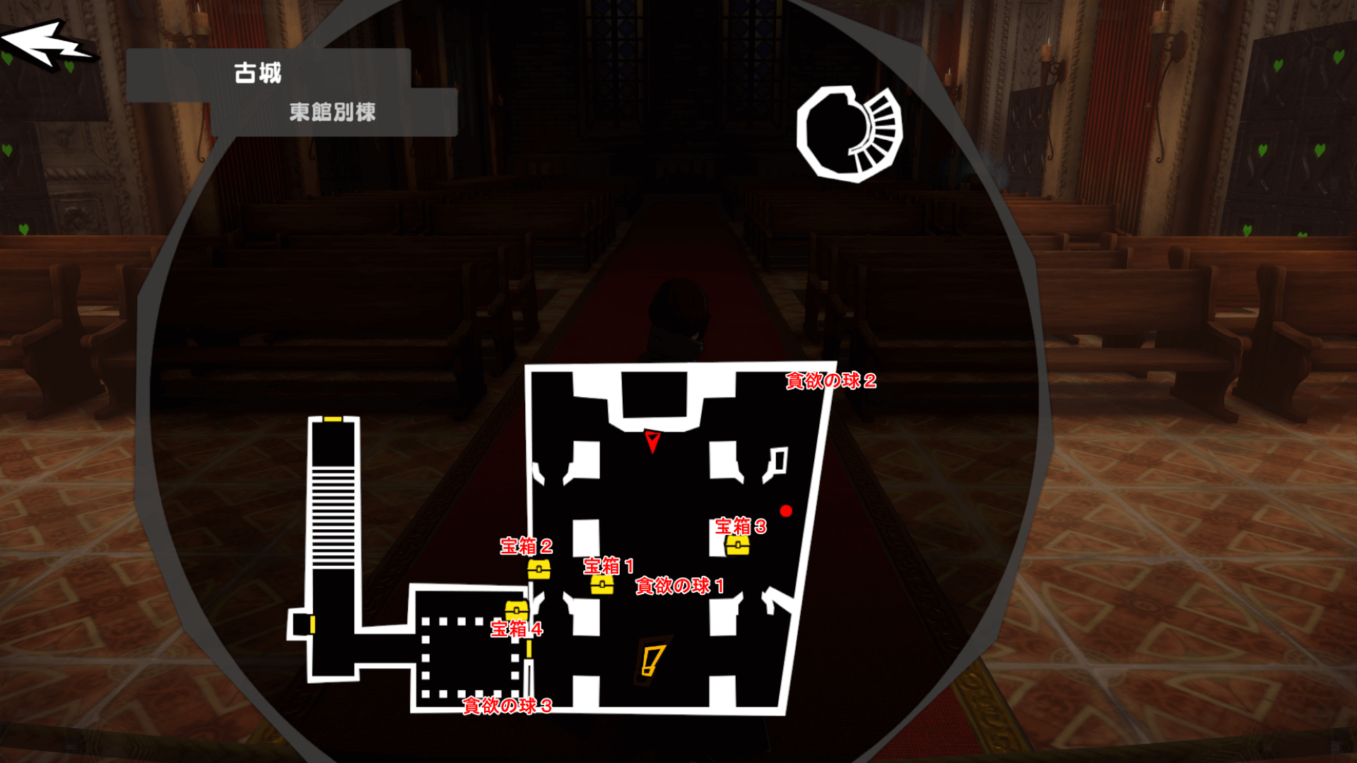 宝箱3,貪欲の球4食堂奥の棚を伝って行く |