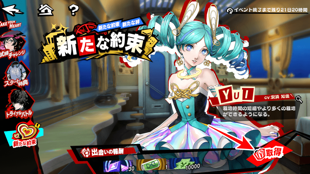 新たな約束は、ミッション「バーチャルな出会い」を進めて「YUI」とのシナジーを解放すると、報酬が受け取れるイベントだ。イベント終了後もシナジーは解放できるが、報酬は貰えなくなるので必ず期間内にクリアしよう。