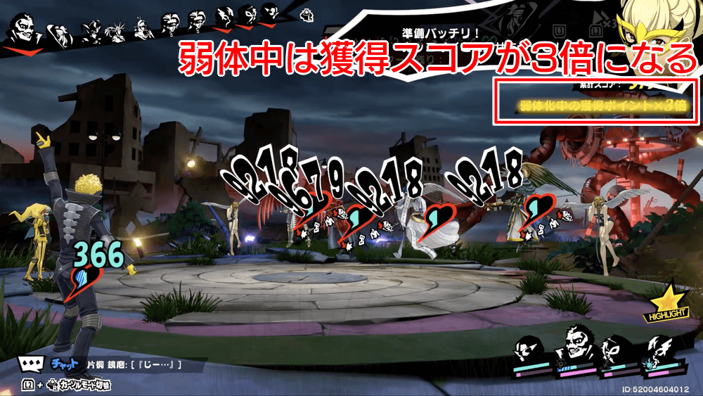 ボスのHPを削りきって弱体状態に入ったら、最大火力をぶつけてスコアを稼ごう。弱体状態中のスコアは3倍で計算されるため、弱体状態で与えたダメージ量によってスコアに大きな差が出る。前準備が必要な場合は敵を倒すタイミングも調整し、スコア獲得を狙おう。