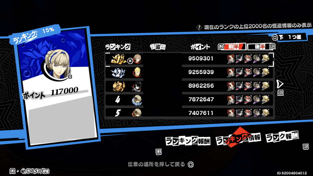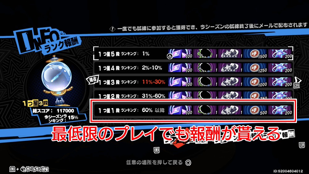 勝てない場合や、星獲得のターン数に間に合わない場合でも、オート戦闘でとりあえず進めておくと良い。1戦でも記録が残れば、シーズン報酬が貰えるため、大損には繋がらない。ランキング報酬の変動要素は「調伏の紋章」の入手数だけなため、星結晶や自在結晶は全員同じ数だけ手に入る。