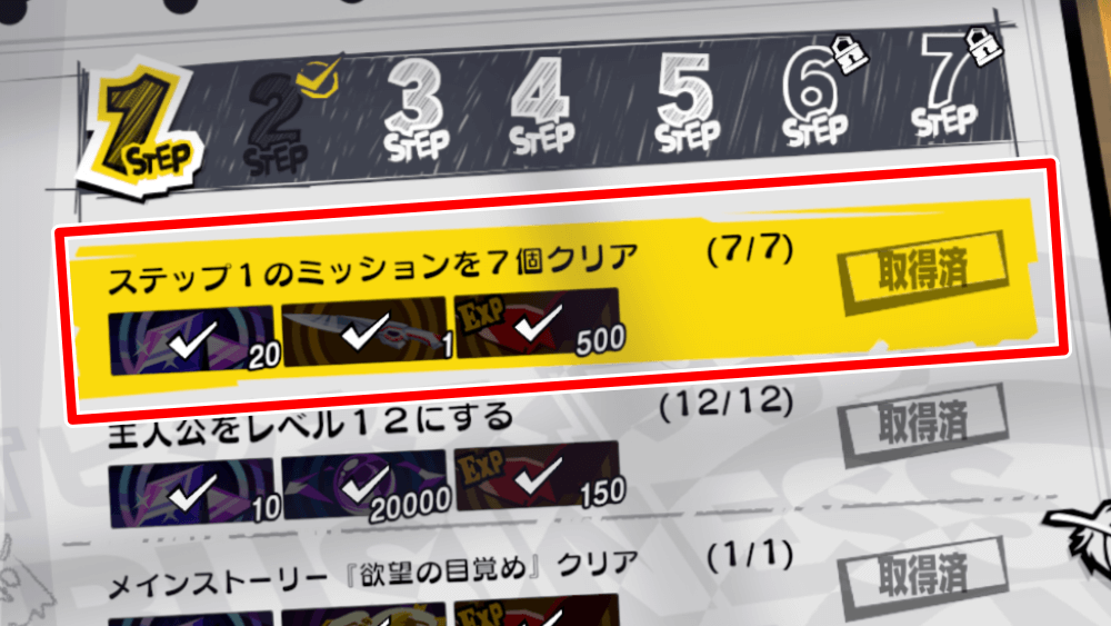各ステップの「ステップのミッションを◯個クリア」を達成すると、次のステップが解放される。指定数のミッションをクリアすれば、すべてクリアしていなくても次へ進めるため、やりやすいものから挑戦しよう。