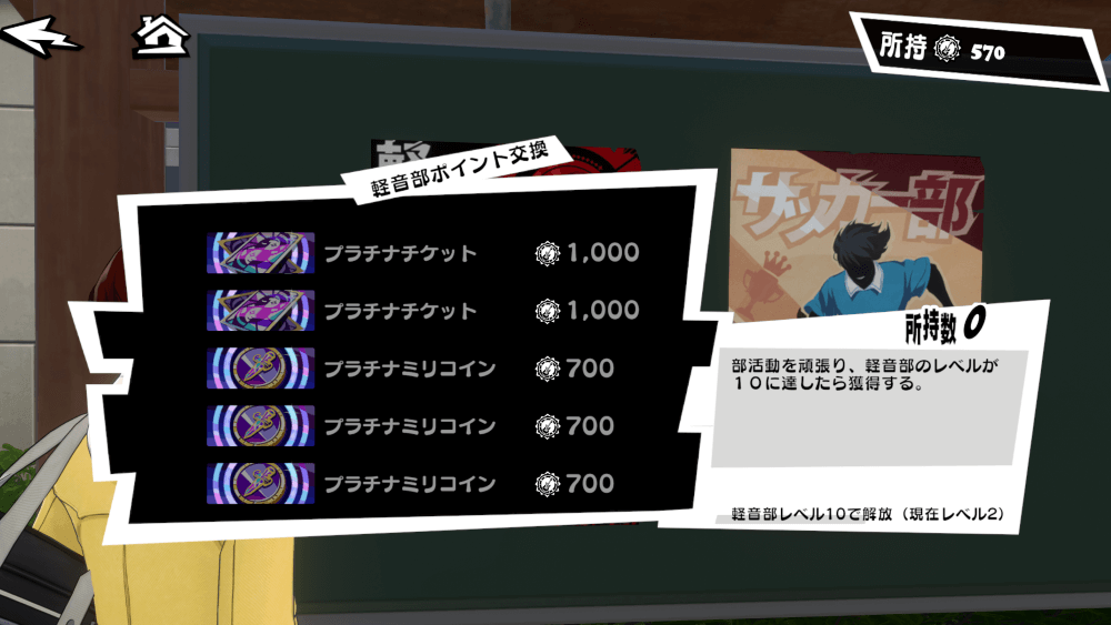 ミニゲームクリア時に貰える軽音部バッジは、学校中庭の掲示板にある部活ショップで、ガチャチケやアイテムなどと交換できる。基本的にはプラチナチケット交換を優先し、取りきったら他のアイテムに切り替えていくのがおすすめだ。