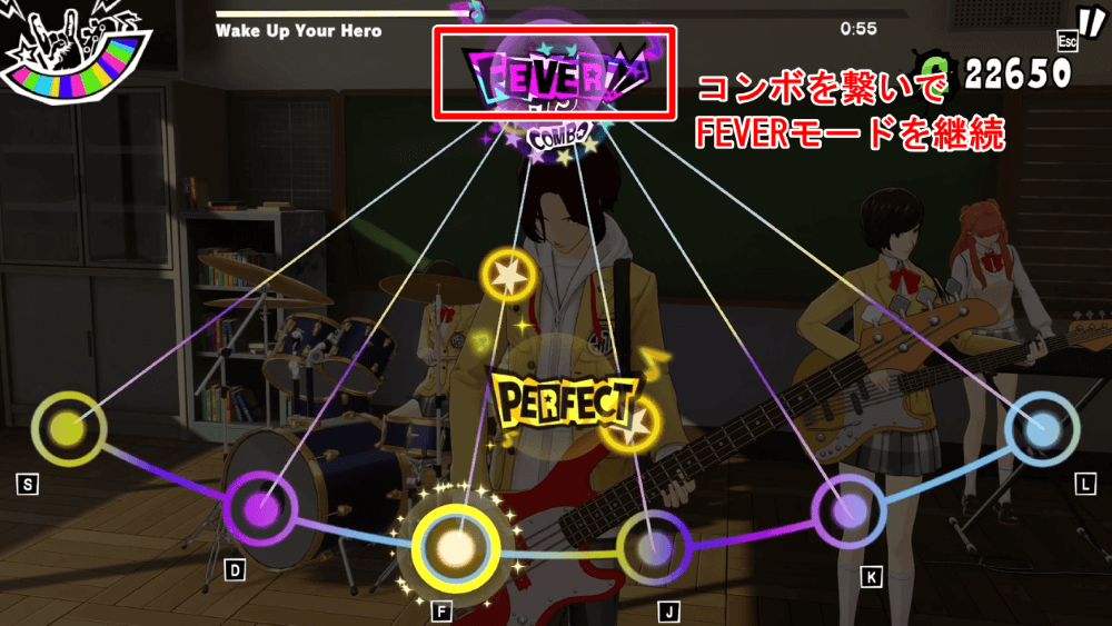 軽音部の音ゲーでは、コンボが続くほど各ノーツのスコアが高くなり、スコアを稼ぎやすくなる。また獲得スコアが大幅に上がるFEVERモードは、コンボが中断されない限り継続するため、「GOOD」以上を出し続けてコンボを途切れさせないことが重要だ。