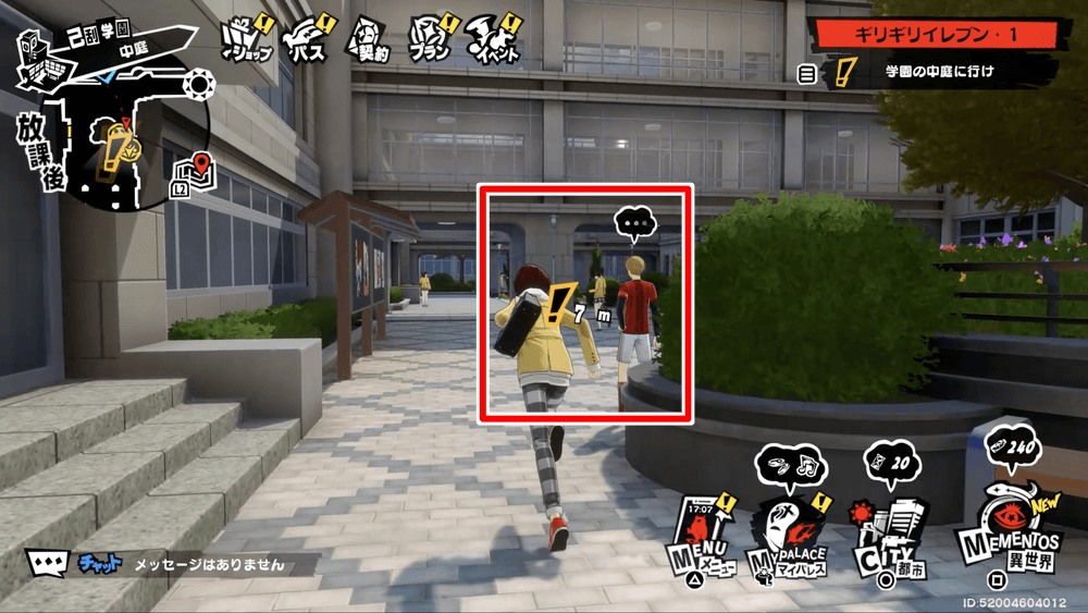 サイドクエスト「ギリギリイレブン」は、晴れた日に学校の中庭に入ると自動で開始する。ミッション欄から次の目標に設定すると晴れた日の昼に時間が切り替わるため、天候や時間に問題があるなら活用しよう。