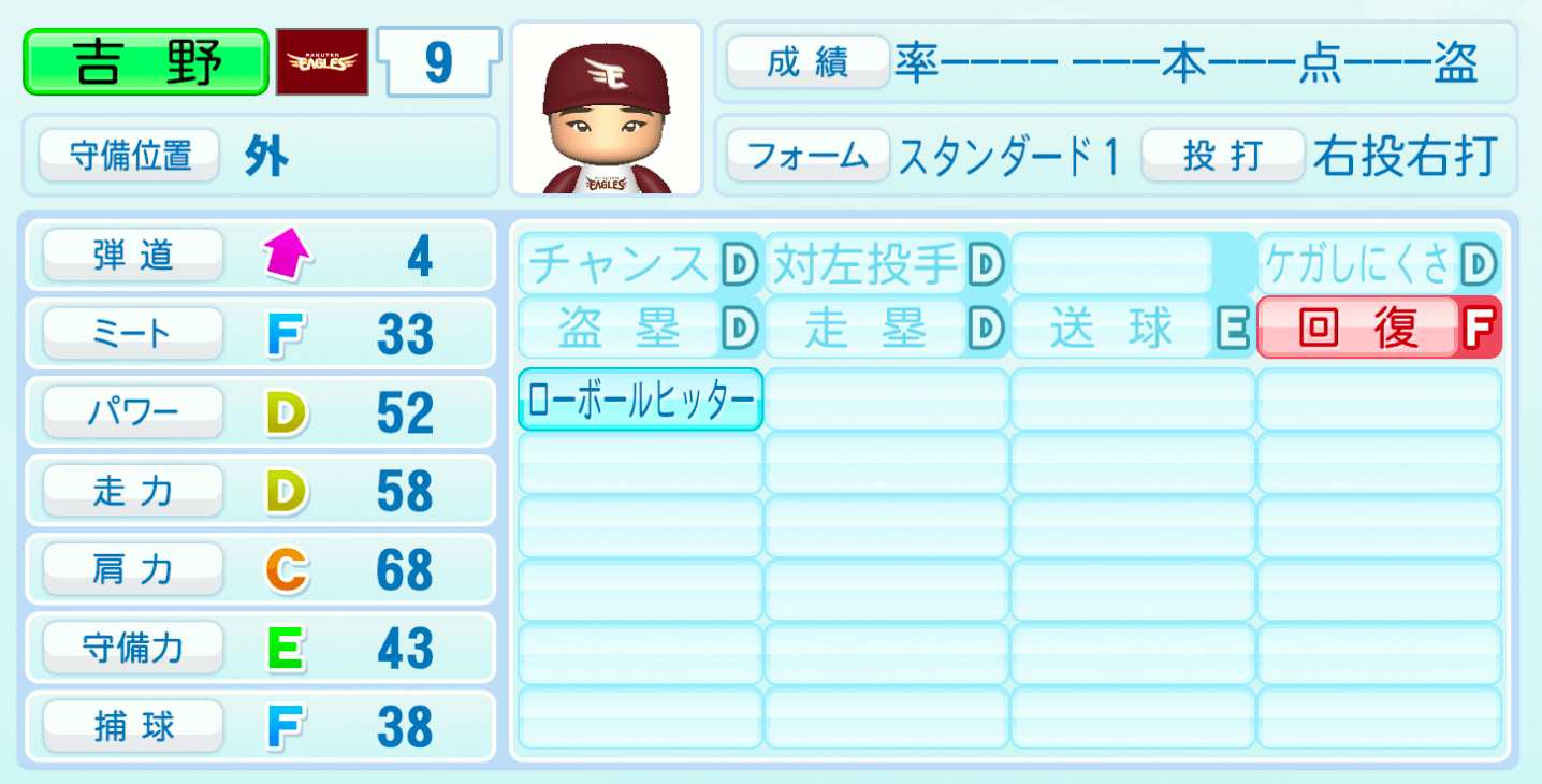 | 守備位置 | 弾道 | ミー | パワ | 走力 | 肩力 | 守備 | 捕球 |