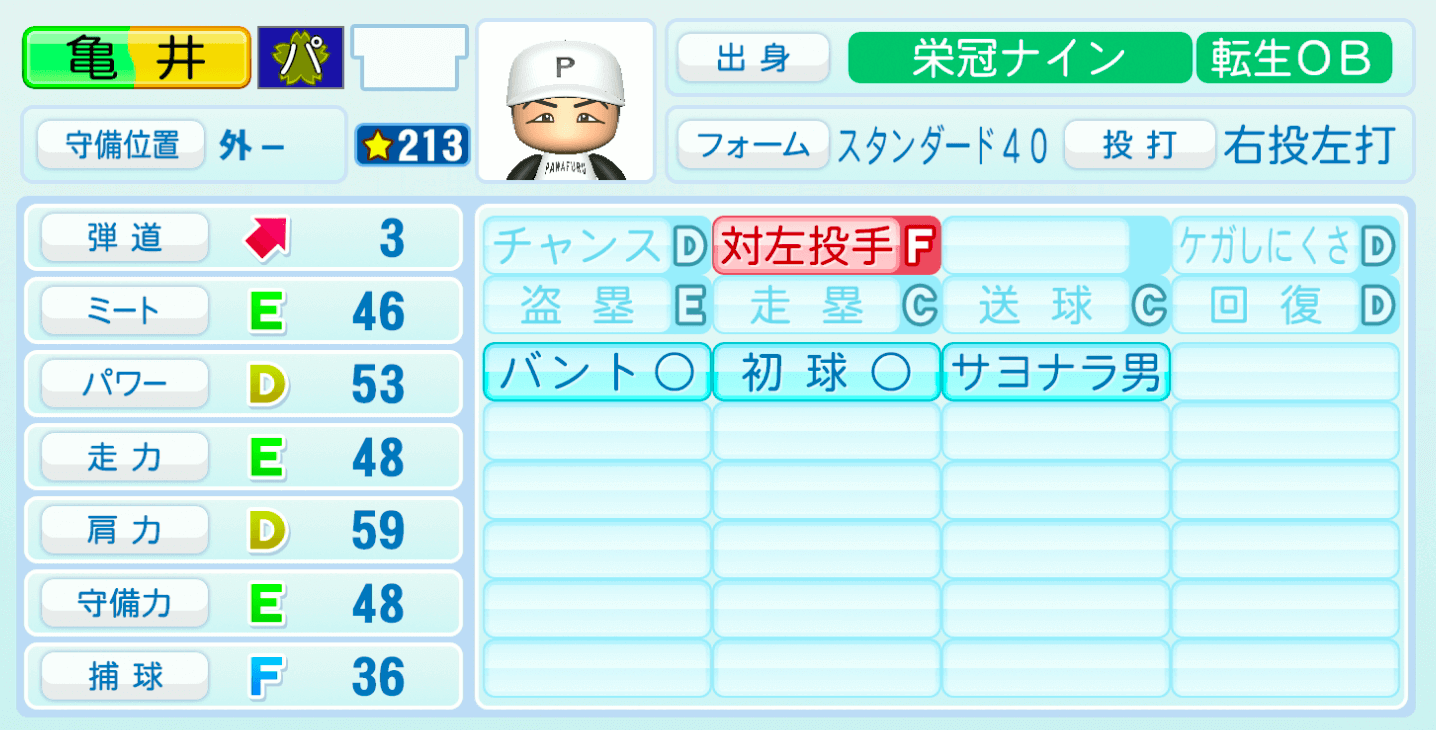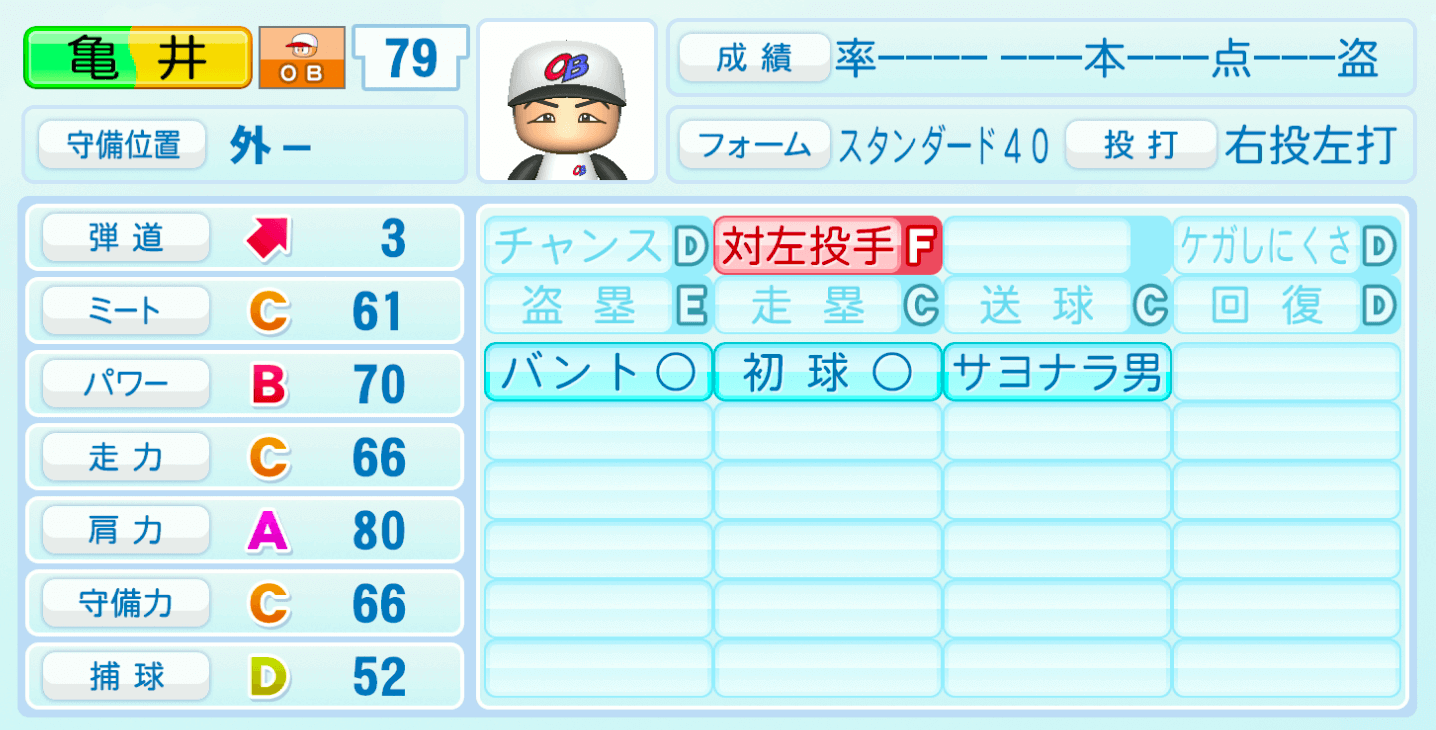 | 守備位置 | 弾道 | ミー | パワ | 走力 | 肩力 | 守備 | 捕球 |