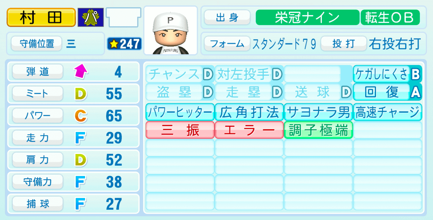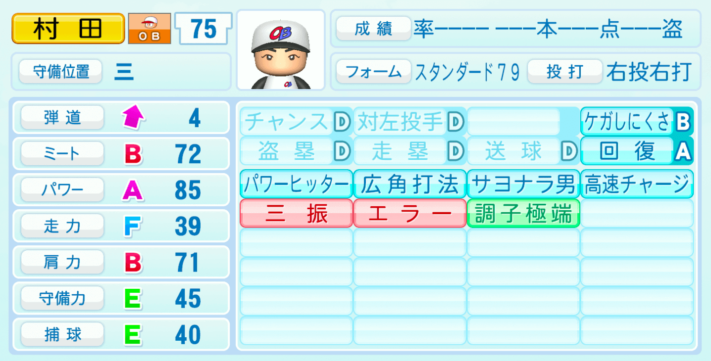 | 守備位置 | 弾道 | ミー | パワ | 走力 | 肩力 | 守備 | 捕球 |