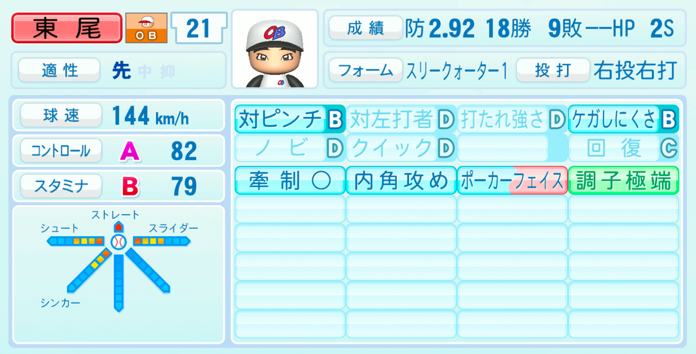 | 守備位置 | 弾道 | ミー | パワ | 走力 | 肩力 | 守備 | 捕球 |