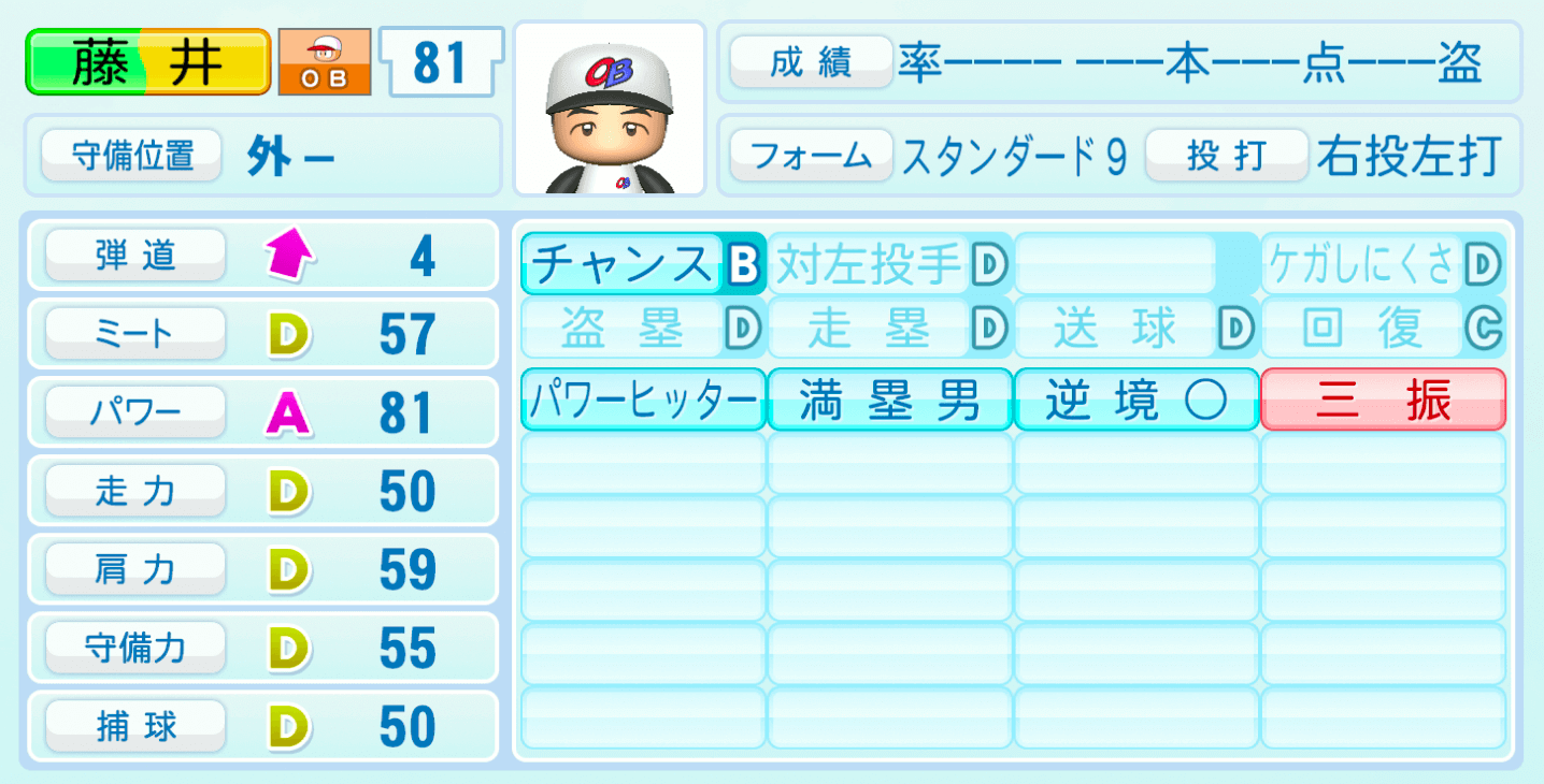 | 守備位置 | 弾道 | ミー | パワ | 走力 | 肩力 | 守備 | 捕球 |