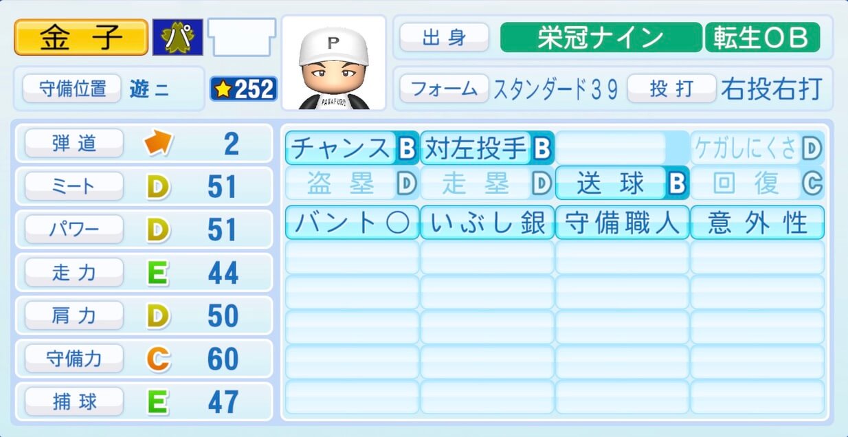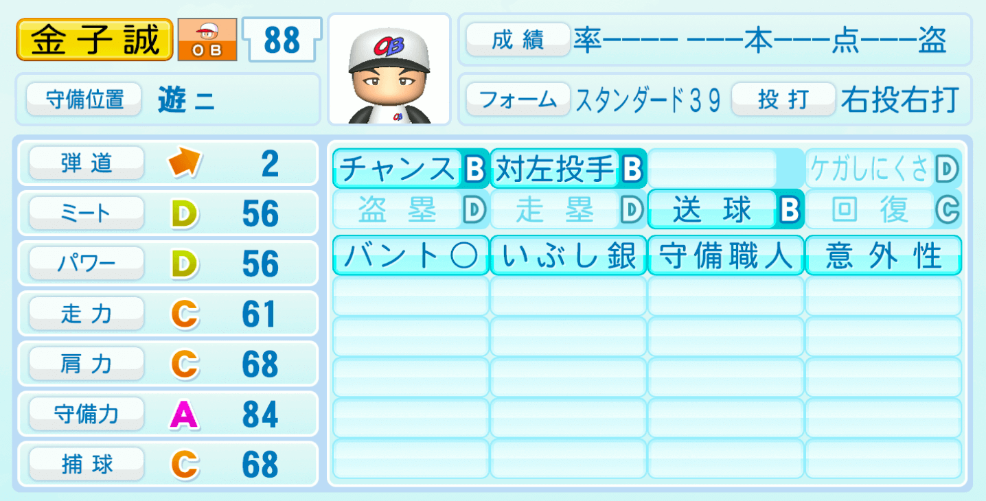 | 守備位置 | 弾道 | ミー | パワ | 走力 | 肩力 | 守備 | 捕球 |