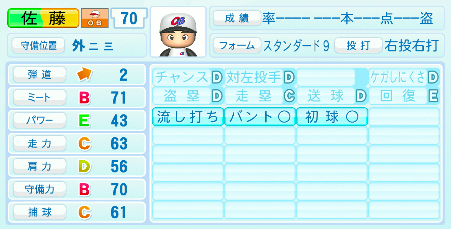 | 守備位置 | 弾道 | ミー | パワ | 走力 | 肩力 | 守備 | 捕球 |