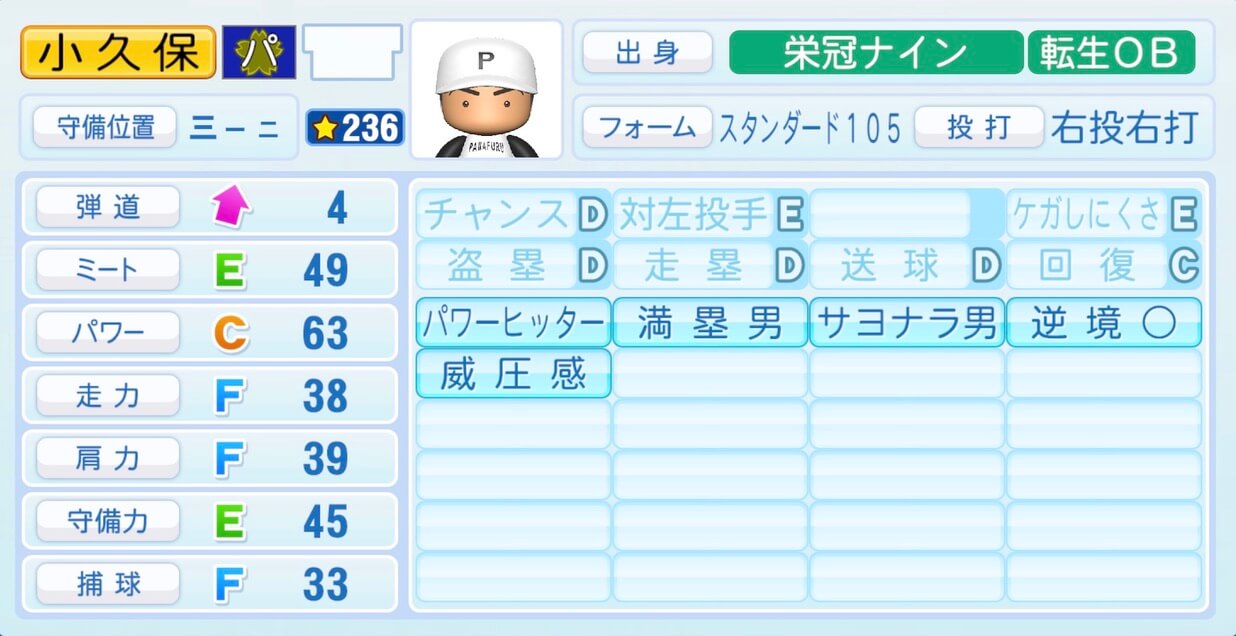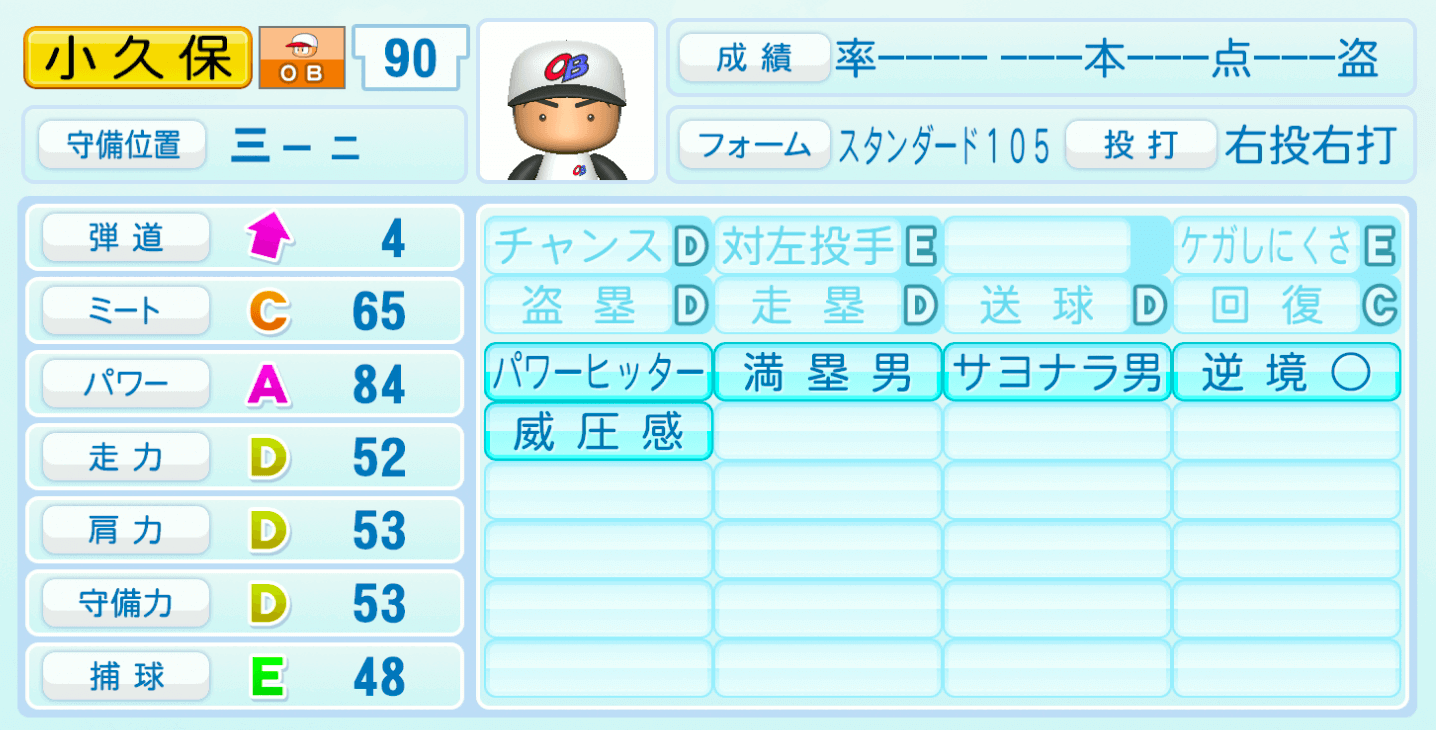 | 守備位置 | 弾道 | ミー | パワ | 走力 | 肩力 | 守備 | 捕球 |