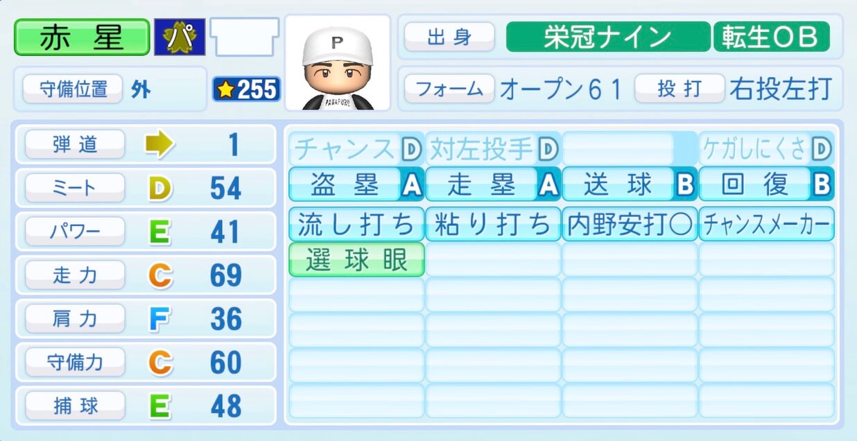 | 守備位置 | 弾道 | ミー | パワ | 走力 | 肩力 | 守備 | 捕球 |