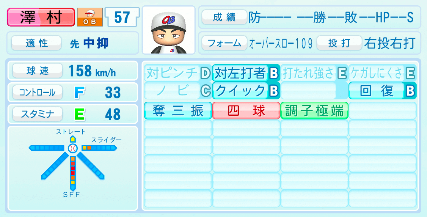| 適性 | 中抑/先 | 球速 | 158km/h |