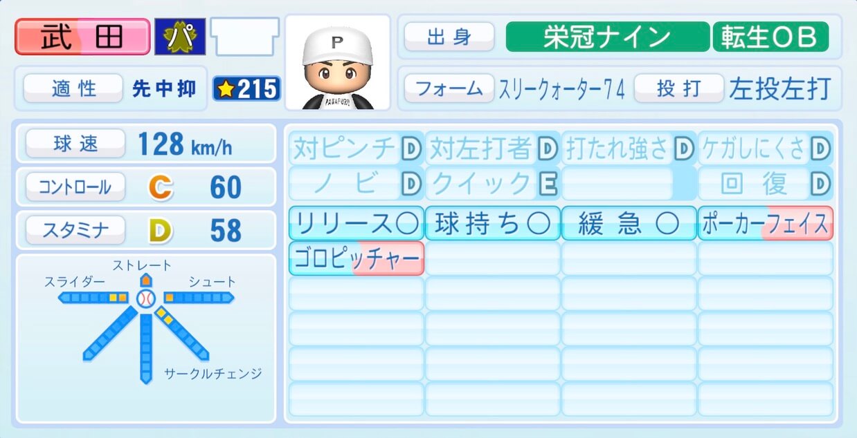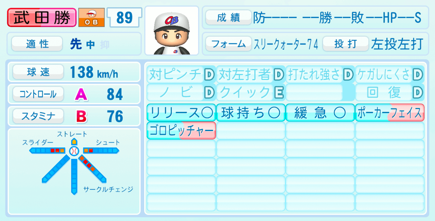 | 適性 | 先/中 | 球速 | 138km/h |