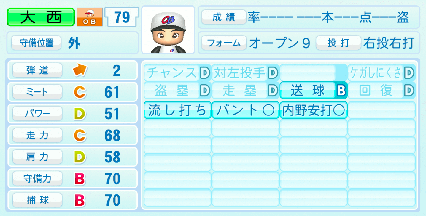 | 守備位置 | 弾道 | ミー | パワ | 走力 | 肩力 | 守備 | 捕球 |