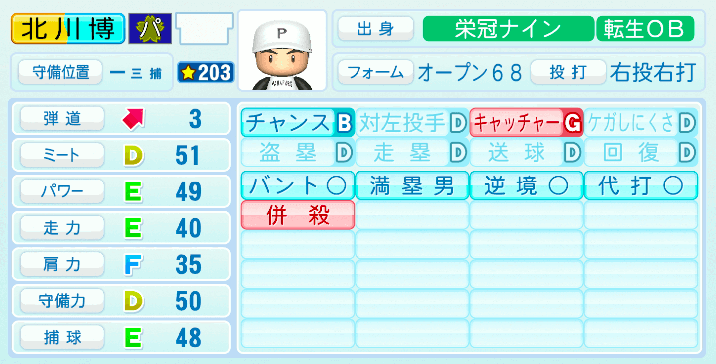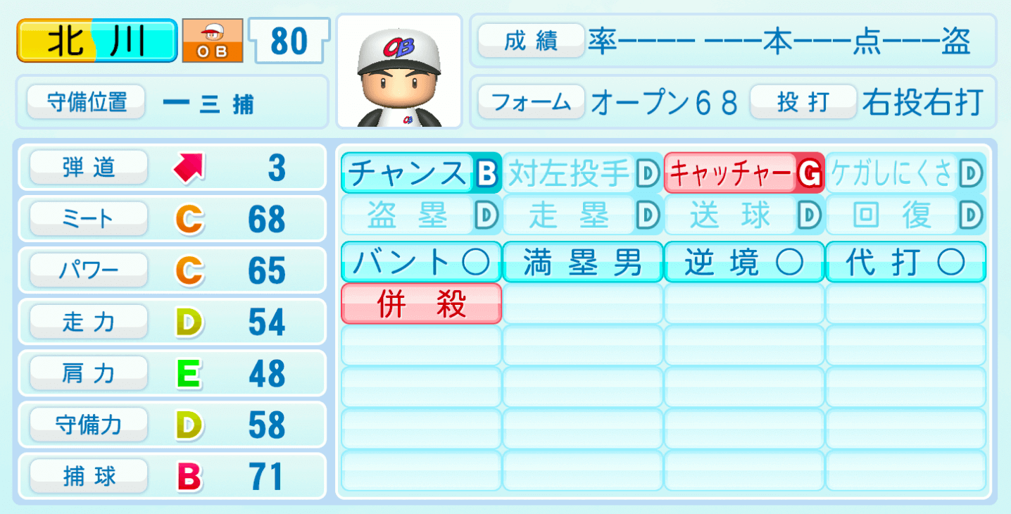 | 守備位置 | 弾道 | ミー | パワ | 走力 | 肩力 | 守備 | 捕球 |