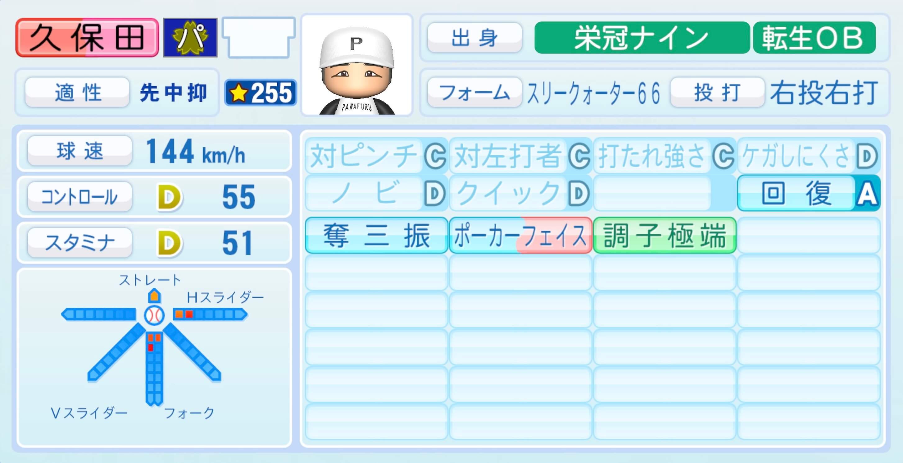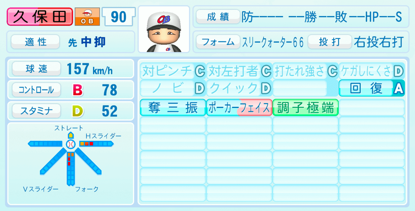 | 適性 | 中抑/先 | 球速 | 157km/h |